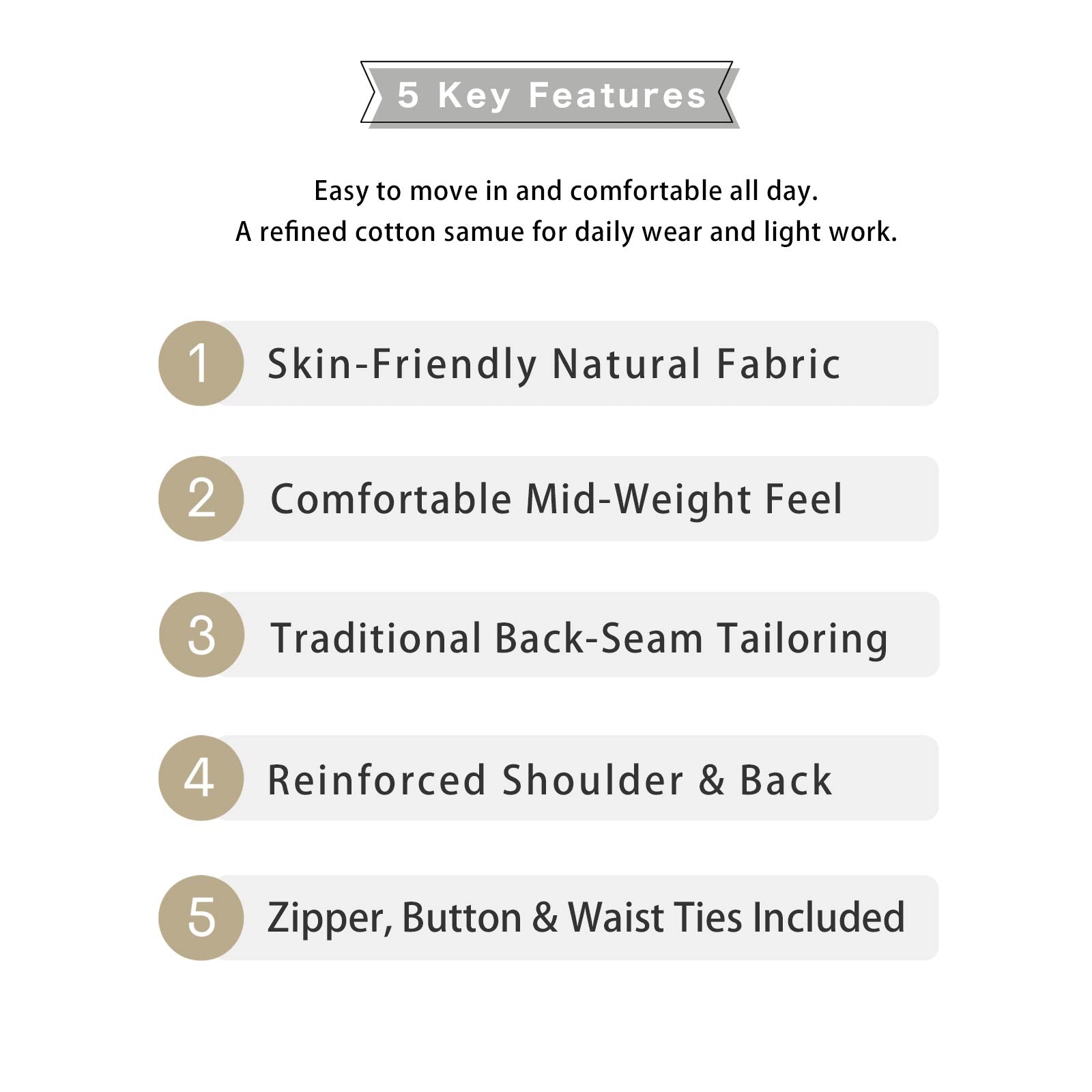 日本の伝統的な仕立てと背中芯の縫い目により、すっきりとしたバランスの取れたシルエットを保ちます。肩と背中の補強により、耐久性も抜群です。